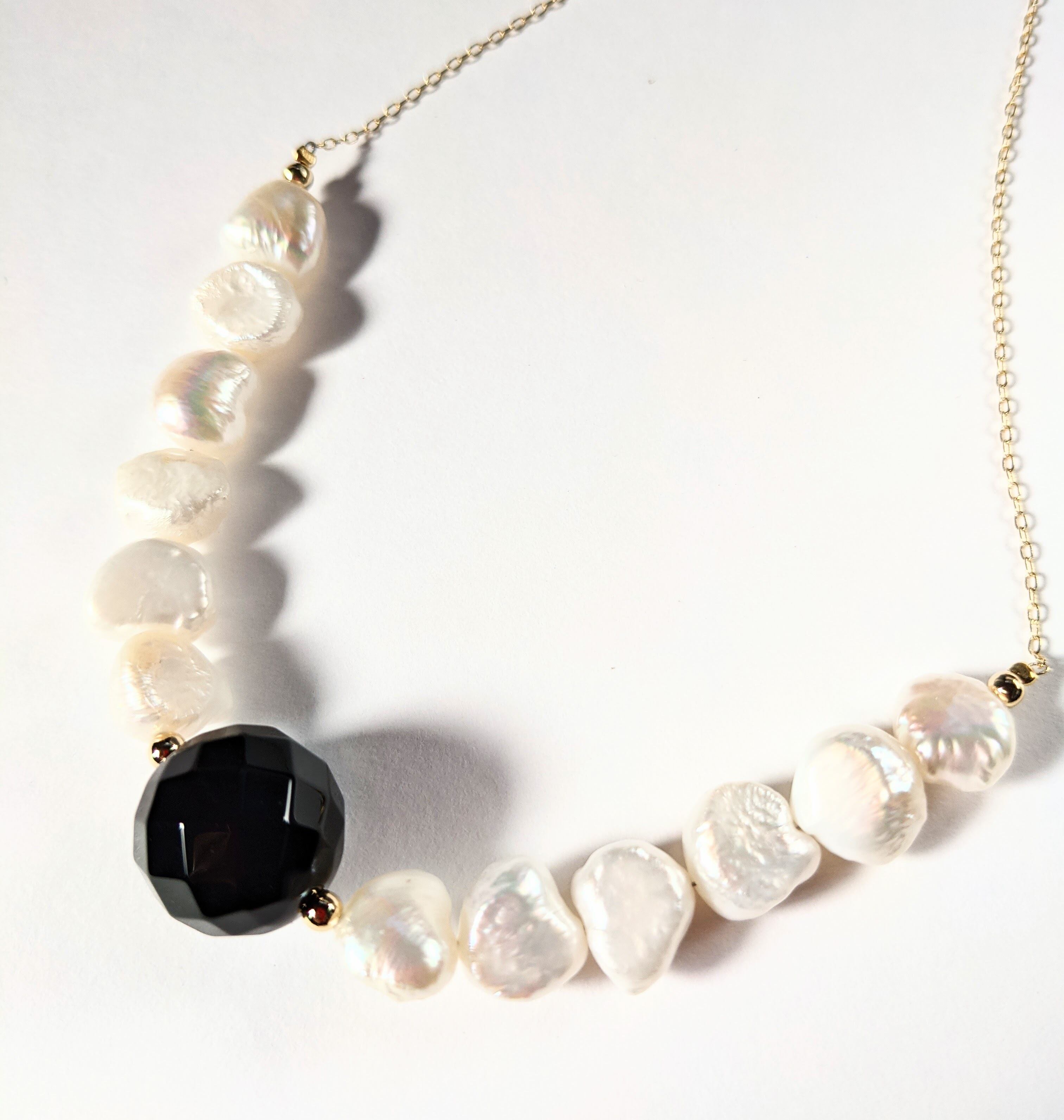 上品な輝きを放つ「淡水とオニキス #35」のネックレスです。中央のオニキスが存在感を放ち、それを囲む変形の淡水パールがアクセントになっています。カットされたオニキスはこのネックレス全体に高級感をもたらしています。金色の鎖が華やかさを添えてシンプルながらもエレガントな印象です。これからの季節にカジュアルにも、ちょっとしたお集まりにもお着けいただけます。長さ約65cm。オニキス直径約1.5cm。