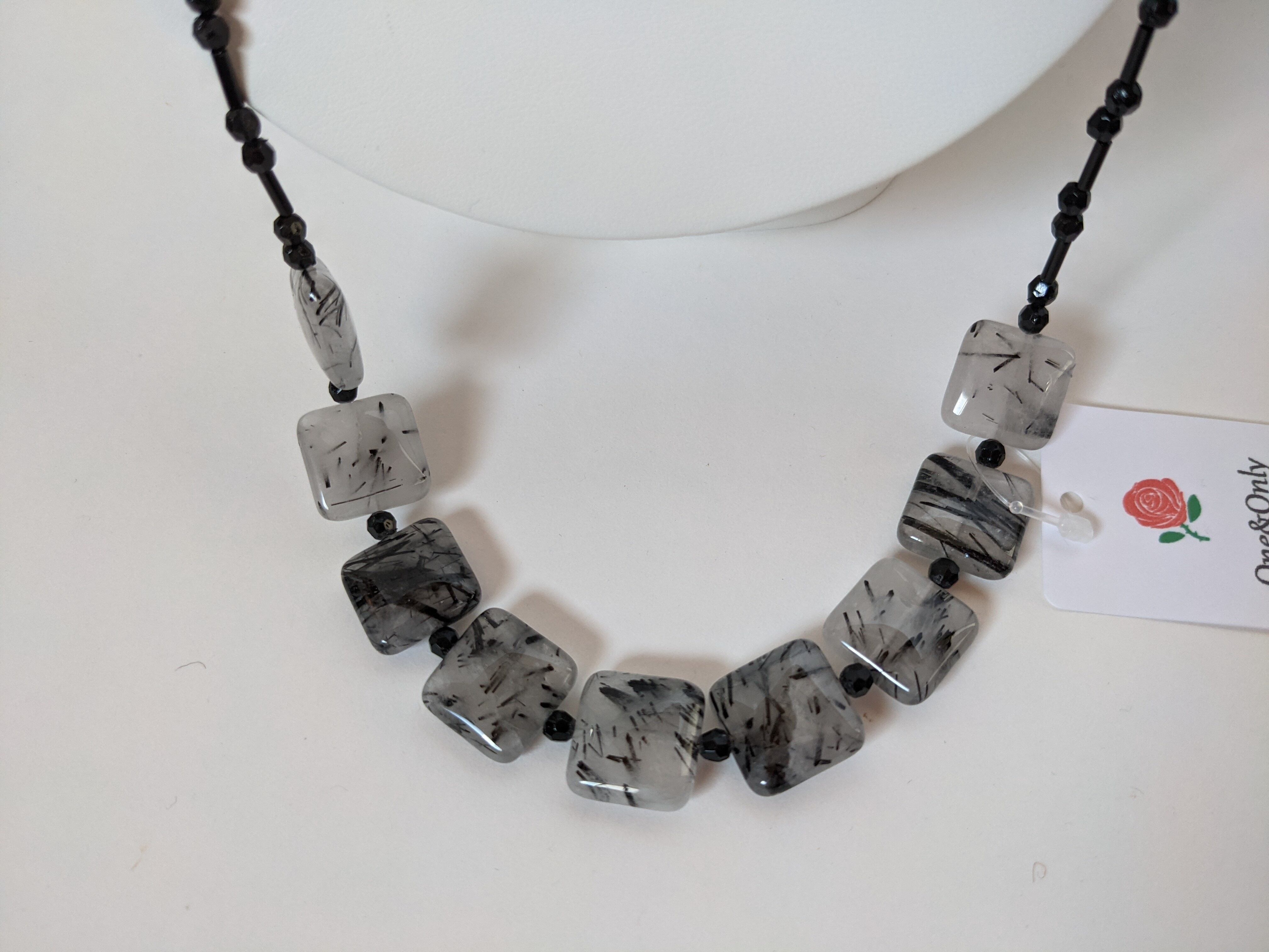 ブラック・ルチルは普通玉形のものが多いのですが、これは珍しい四角のブラック・ルチルを使ったネックレス。フランス製のアクリルパーツで繋いであります。留金がないので、頭からかぶって使えます。ルチルを右に持って行ったり、左に持って行ったりして、ご自分のアレンジをお楽しみください。約75cm。