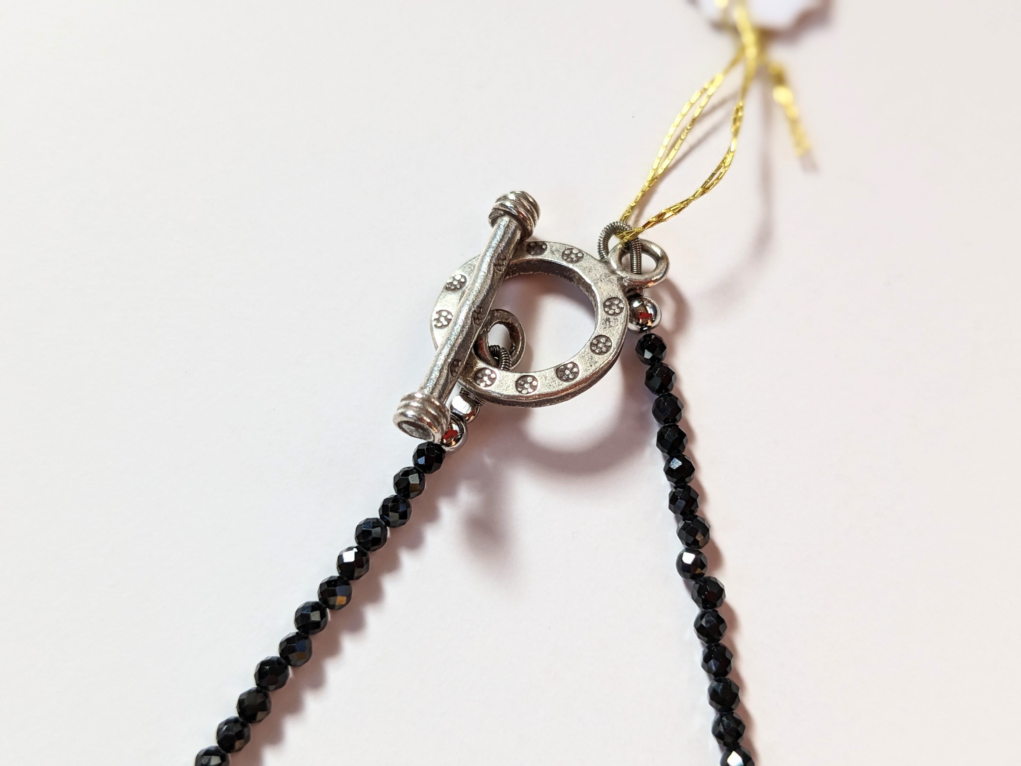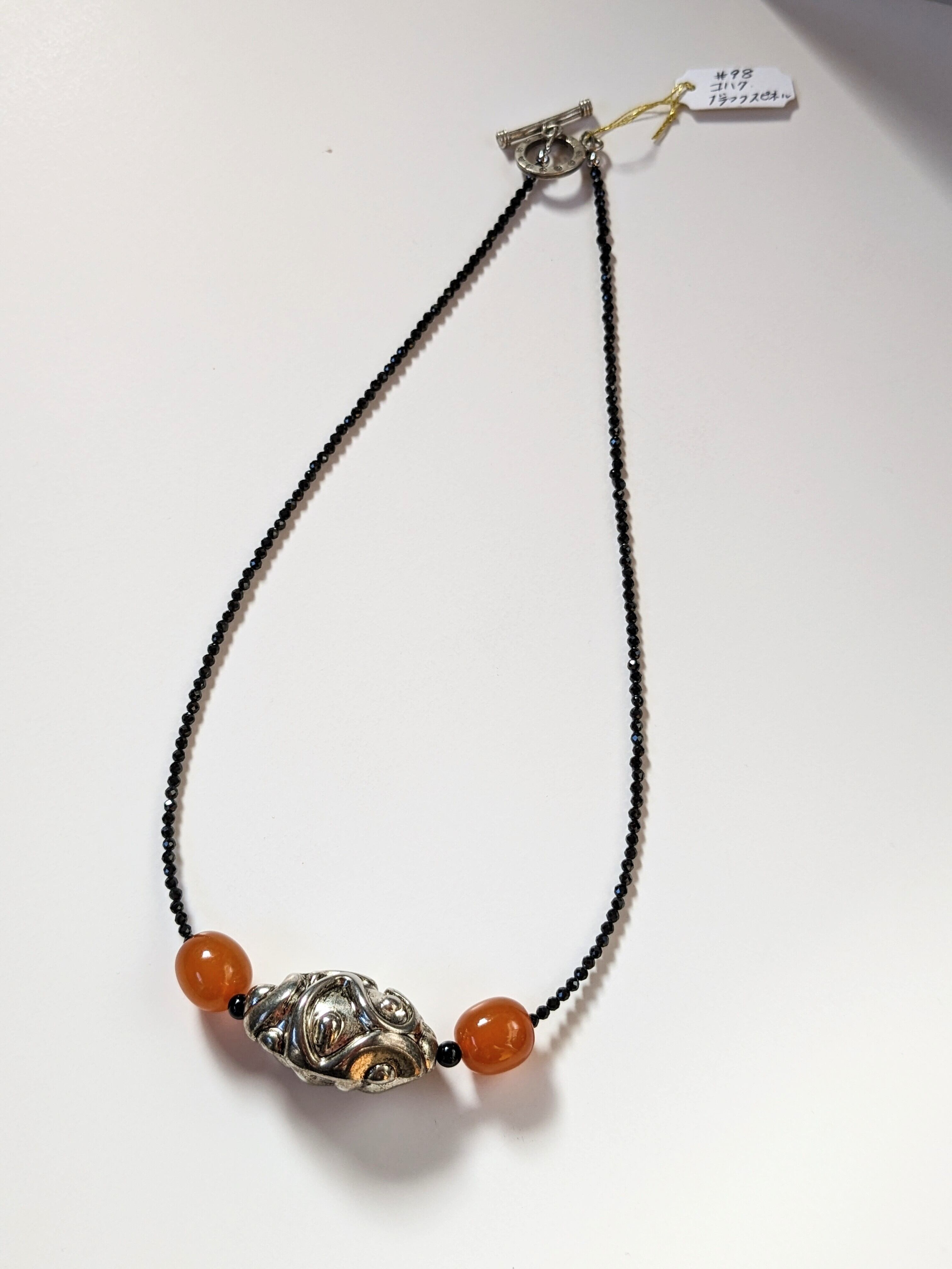 今では大変貴重になった、鮮やかな琥珀を2つ使いました。オニキスとブラックスピネルとのコントラストで中央のベトナム製パーツを際立たせ、さりげないお洒落感をプラス。まるで夜空を彷彿とさせるような、落ち着いた雰囲気がたまらなく素敵なネックレスです。手作りにこだわった留金は、ミャンマーのカレン族によるカレン・シルバーです。手の込んだ作りが細部にまで行き届き、高い品質を誇っています。